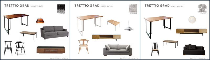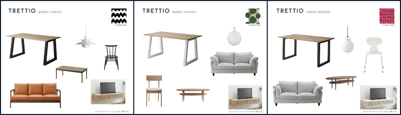 今なお愛され続ける北欧デザイン。TRETTIOがご提案するスタイルそれぞれに、3つのカラーをご用意 しました。どれをチョイスしても失敗のない洗練された住空間を、住まうその日から演出します。